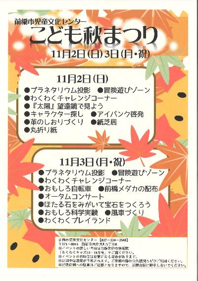 こども秋まつりが開催されます。各種イベントも予定されております。ぜひお越しください。