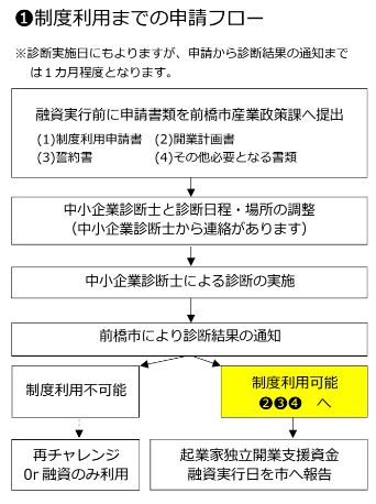 (注意)本制度が利用不可と判断された方でも、「前橋市起業家独立開業支援資金融資制度」の利用自体は可能です。但し、この場合は本制度の経営診断、利子補給、保証料補助は受けられません。