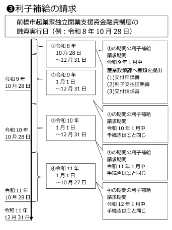 交付内容は、1月1日から12月31日までの間に、本制度を利用して支払った前橋市起業家独立開業支援資金制度に係る利子(融資実行後3年間分)で、融資利率の1%までの額となります。(1,000円未満の端数は切り捨て)