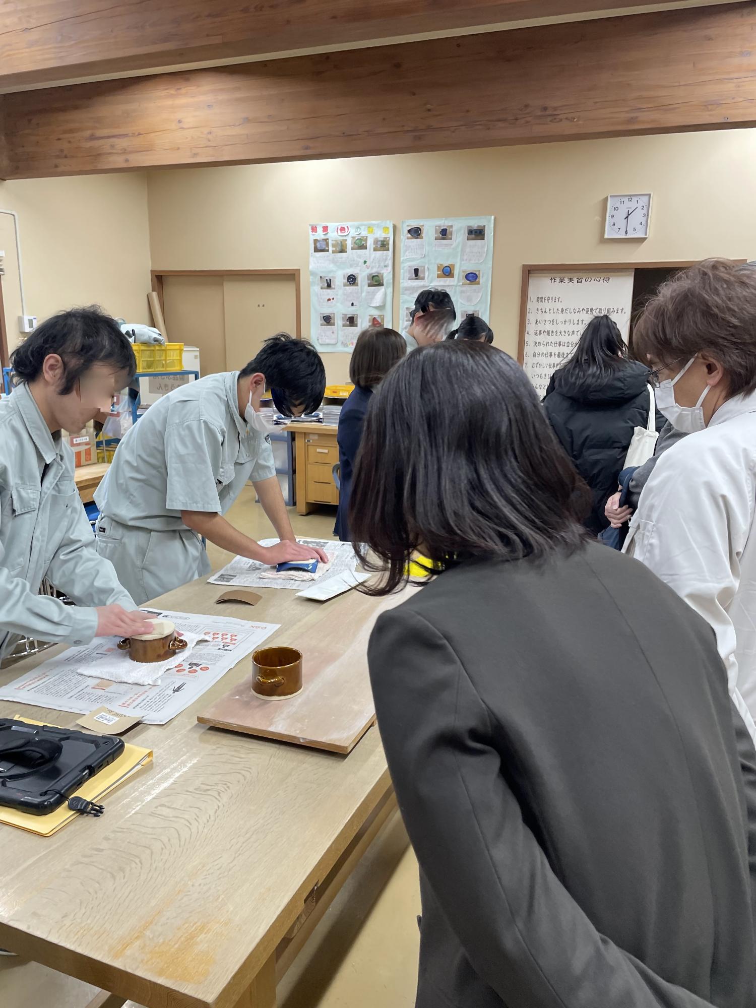 見学会では、学校の専門教科(陶芸、木工、クリーニング、被服、農園など)の実習の様子を見学しました。