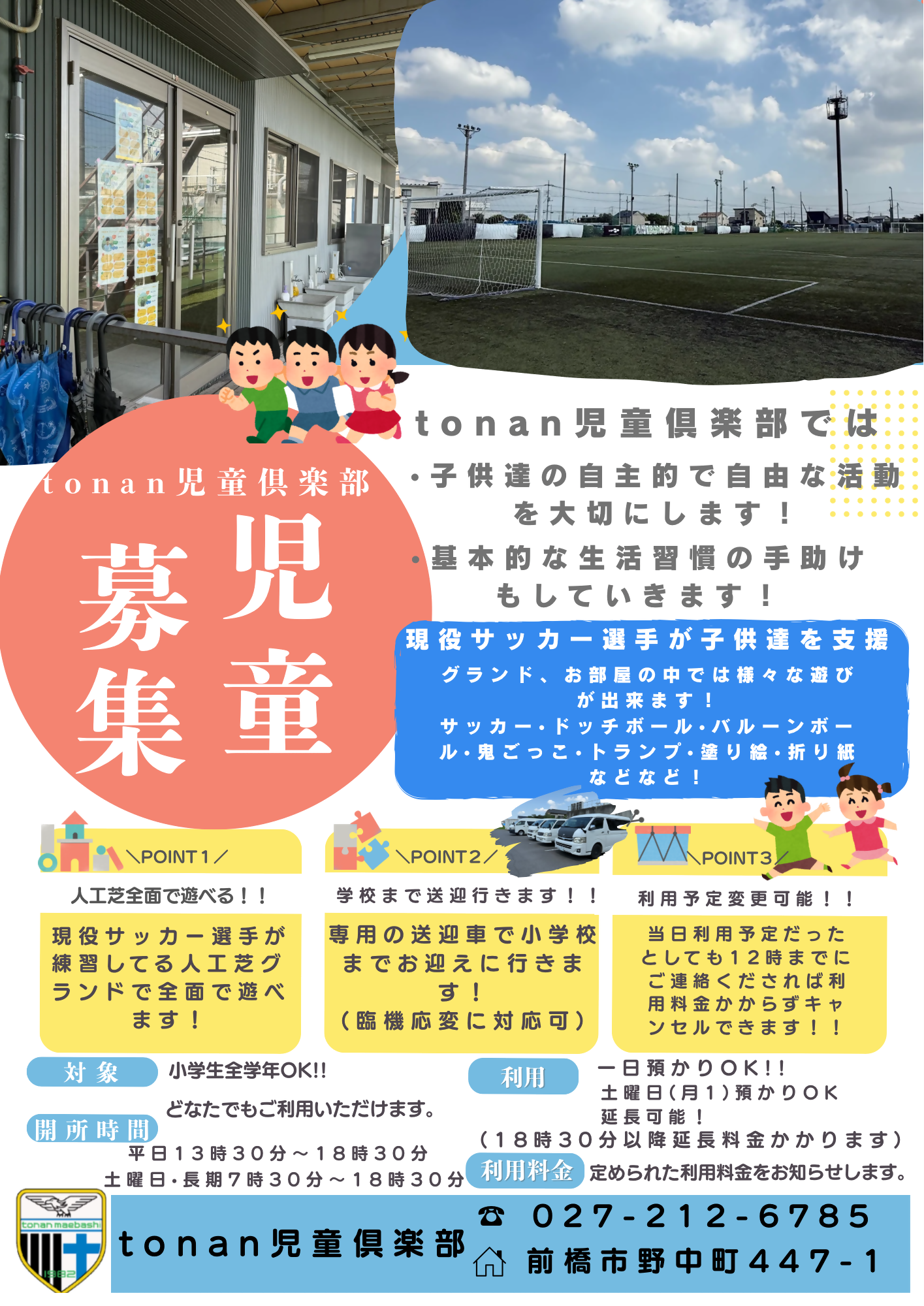 | tonan児童倶楽部 | 永明・桃瀬・桃木・桂萱東 | 野中町447-1 | 027-212-6785 | 一般社団法人図南スポーツクラブ | tonan児童倶楽部(PNG:1.8MB) | |