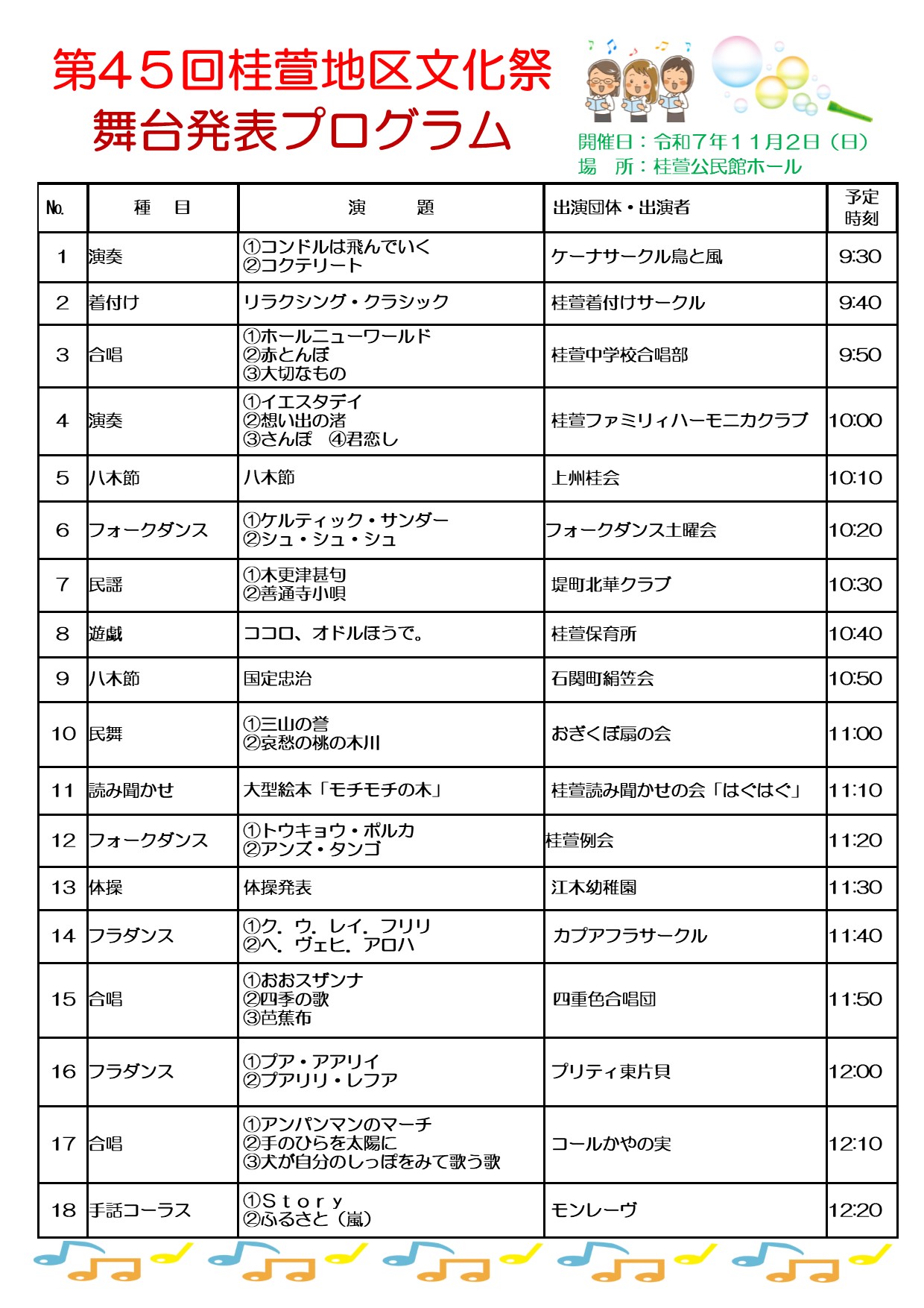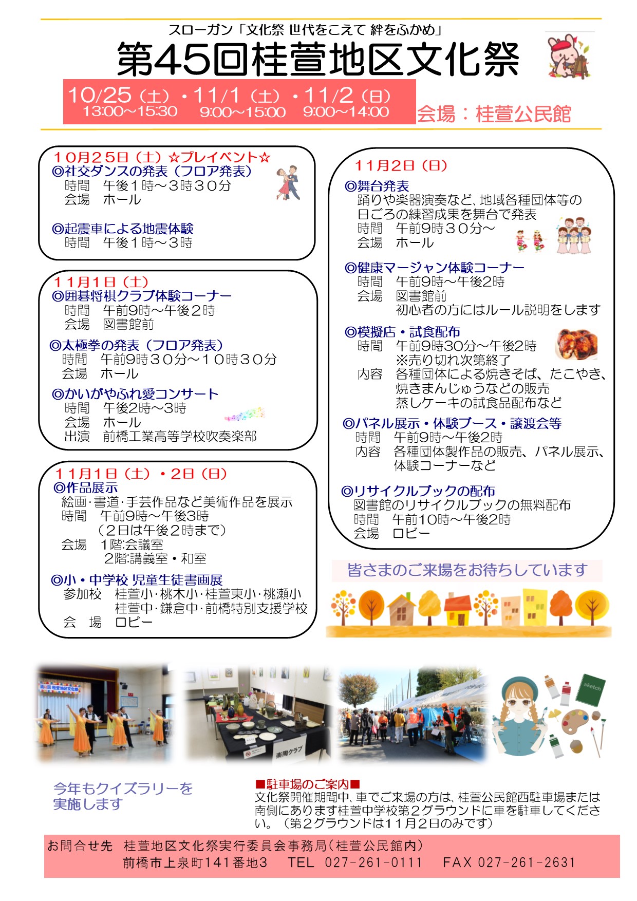 桂萱地区では、市民の地域文化への興味関心を高めると共に、住みよい地域づくりに寄与する目的で第45回桂萱地区文化祭を開催します。皆様のお越しをお待ちしていますので、ぜひご来場ください。 |