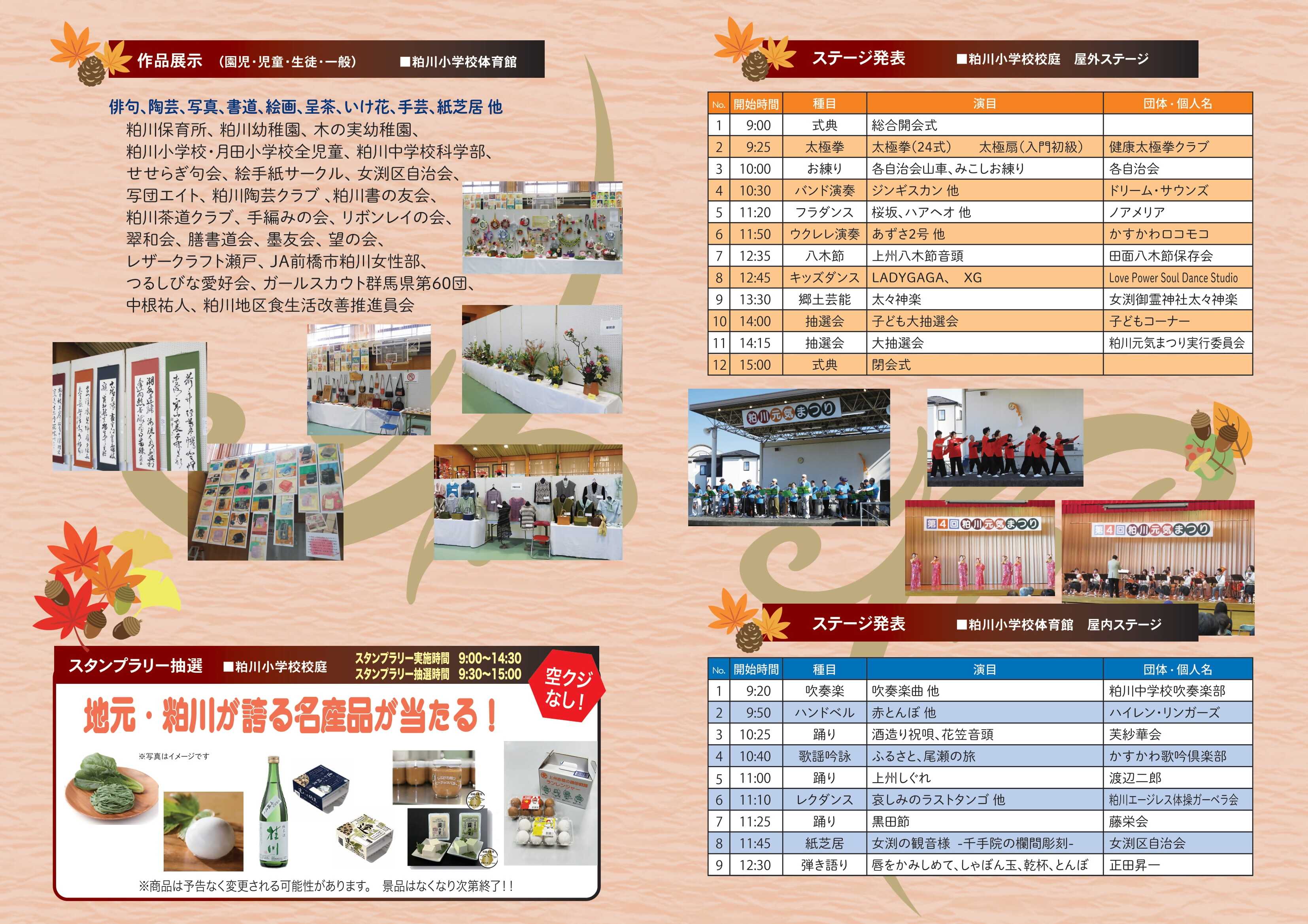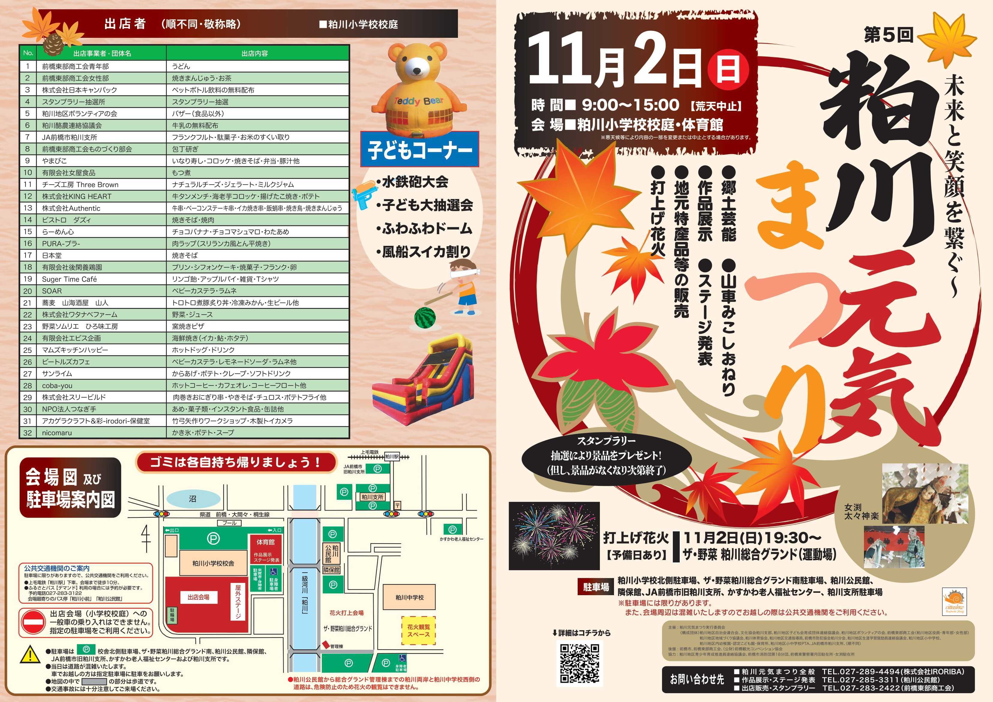 令和7年11月2日(日曜日)午前9時から、粕川小学校校庭及び体育館にて第5回粕川元気まつりが開催されます。ステージ発表や作品展示のほか、特産品の販売や女渕御霊神社太々神楽による舞の披露、山車やみこしの練り歩きなどが行われ、さらに、今年は午後7時30分より、ザ・野菜 粕川総合グランドにて打上げ花火も実施します。