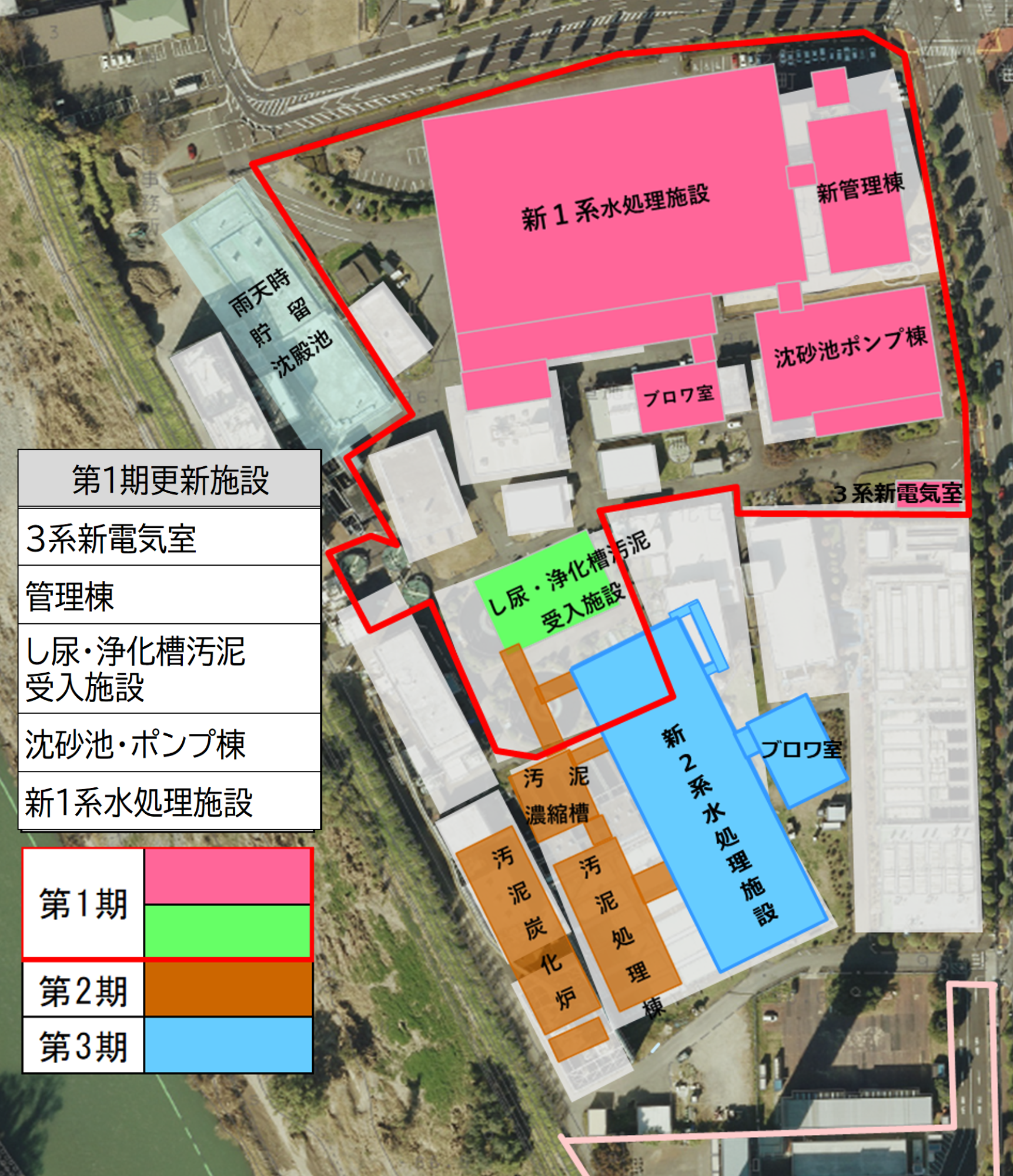 本事業は、狭隘な敷地条件の中で既存施設を稼働させながら更新を進める必要があることから、撤去・新設を繰り返しつつ、全施設を3期に分けて段階的に更新する計画としています。これにより、将来の人口減少等に伴う流入量の変動に対応できる持続可能な汚水処理機能を確保するとともに、耐震性を備えた災害に強い施設への再構築を目指します。