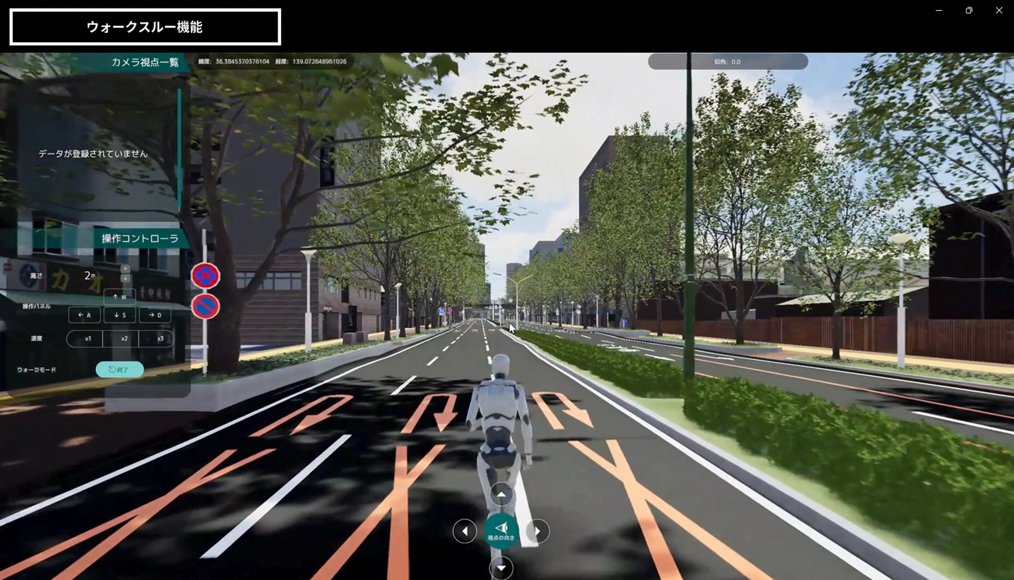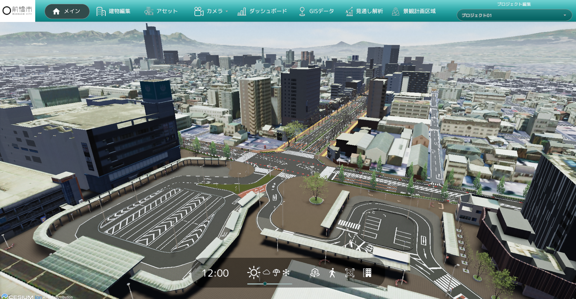 群馬県庁~JR前橋駅間のけやき並木通りにおいて、建築物やアセット(樹木・ベンチ等)のプランニングや都市景観シミュレーションなどの機能を搭載したまちづくりのプラットフォームとして、「前橋市デジタルツイン」を構築しました。